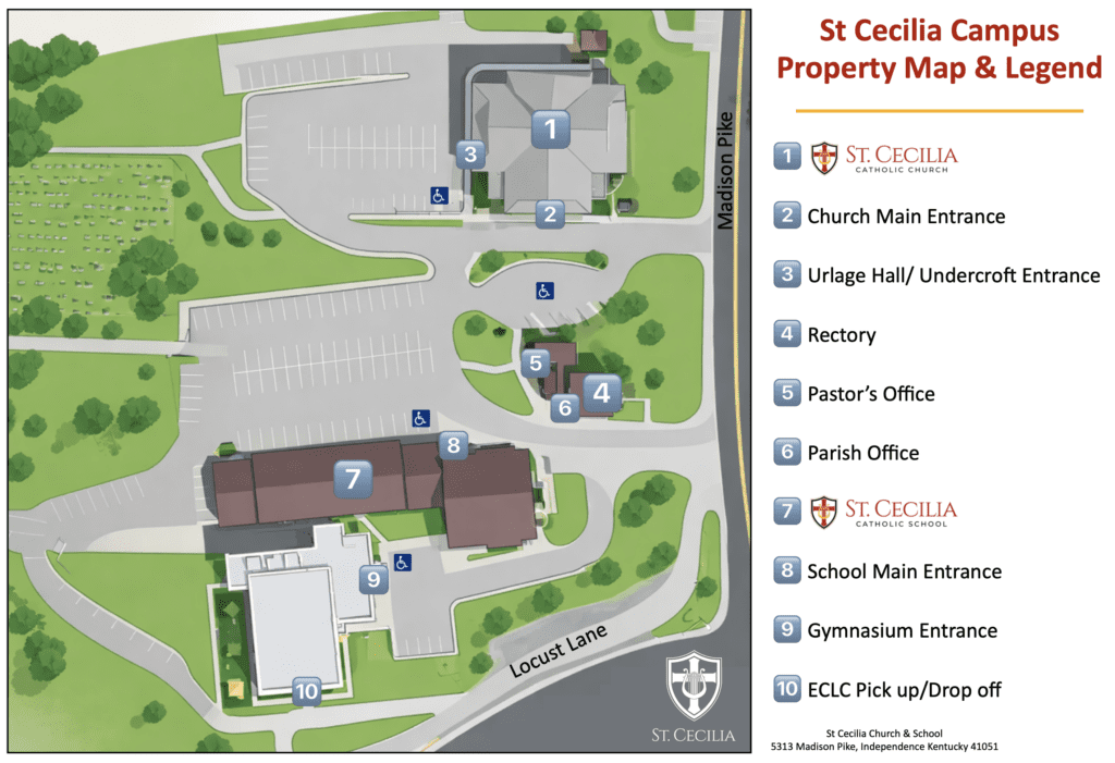 St. Cecilia is blessed with a beautiful and welcoming campus, thoughtfully designed to serve both our parish and school communities. Nestled in a peaceful setting, the property is beautifully maintained, with well-kept grounds that reflect the care and pride of our parish family.